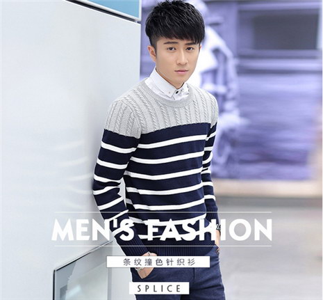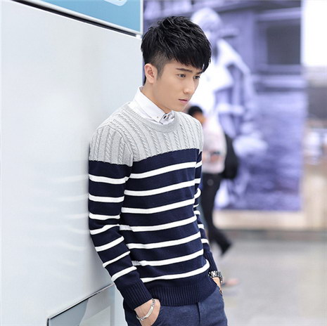 套头休闲条纹撞色麻花毛衣男